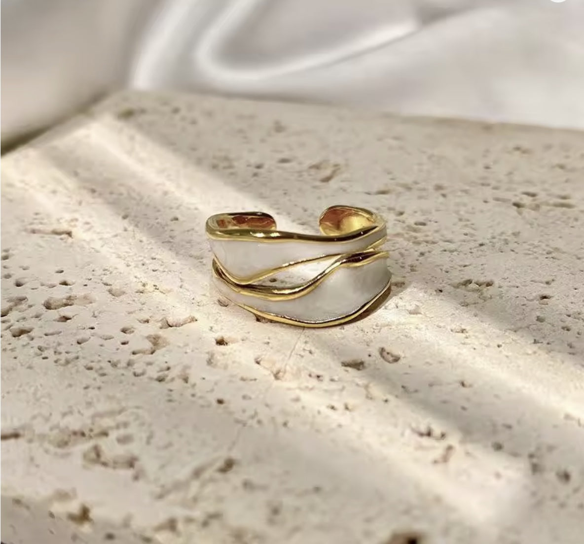 El Hibisco combina líneas onduladas doradas con un acabado nacarado que refleja la luz de forma sutil y elegante.