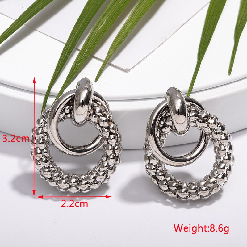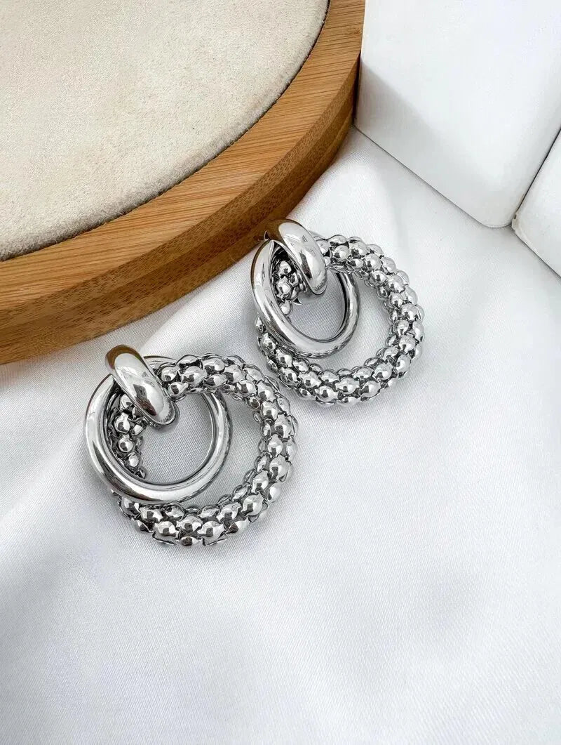 Las Cadiz Plateada combinan textura y volumen con un aire moderno que no pasa desapercibido. Los aros entrelazados, lisos y con detalles esféricos, crean un contraste visual que suma presencia y actitud a cualquier look.