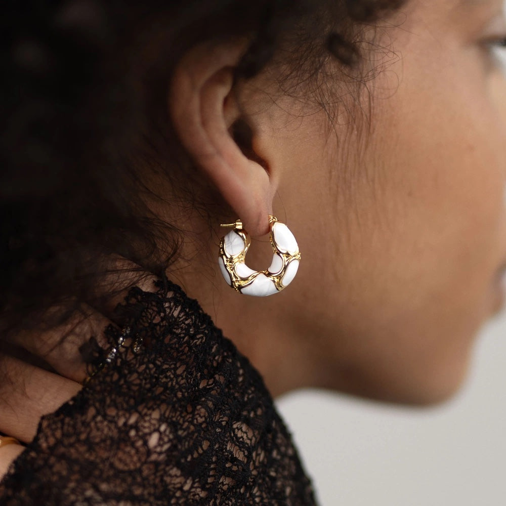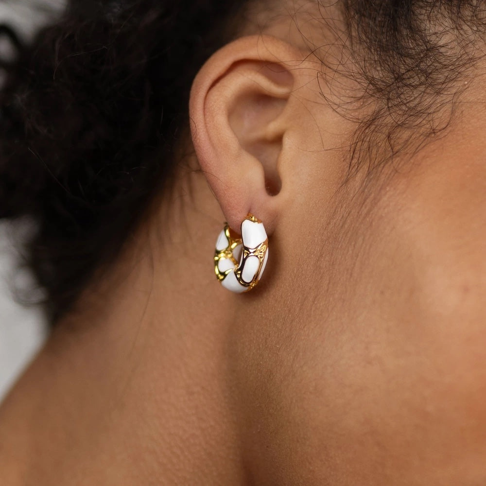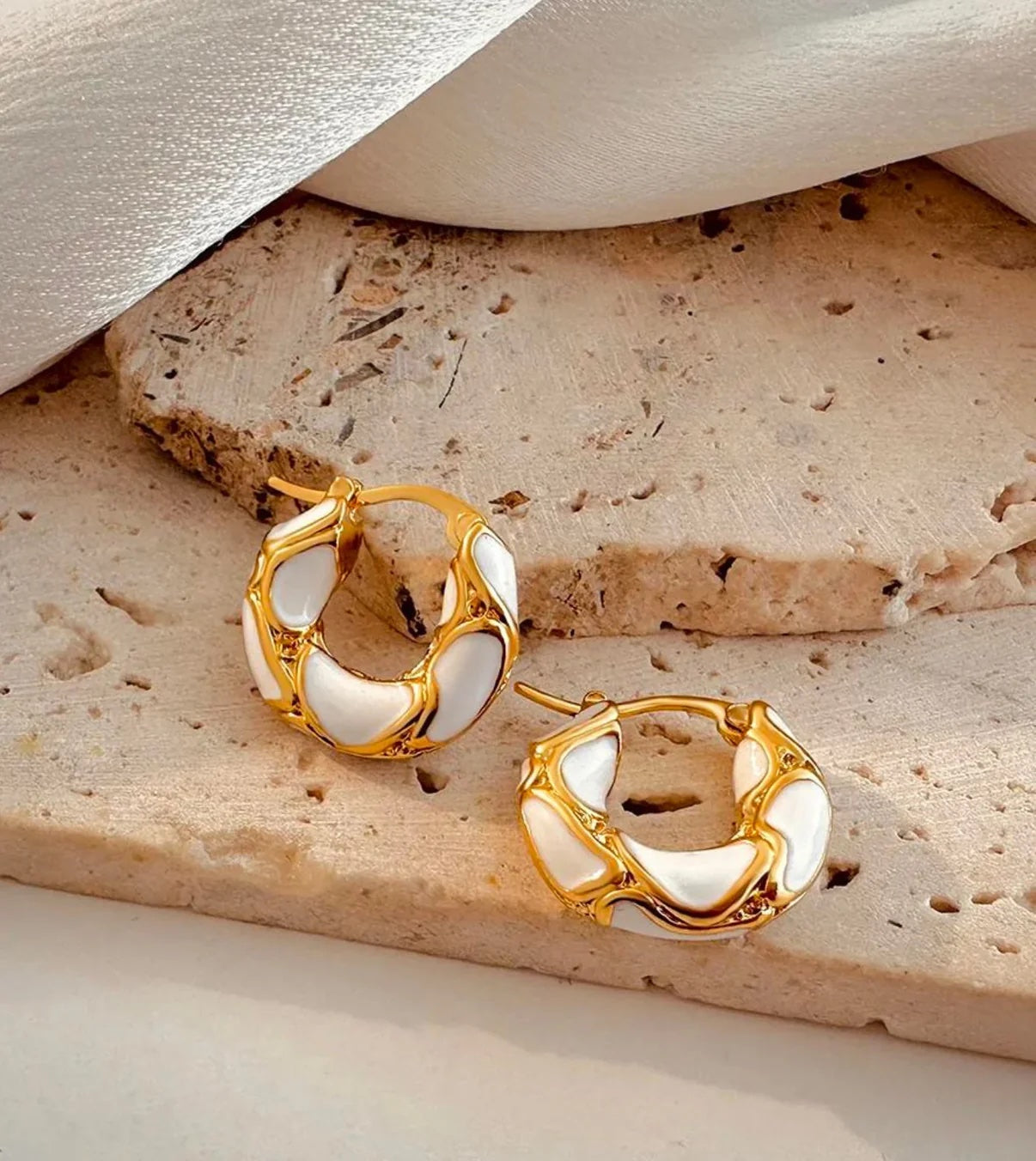 Diseño tipo argolla con base blanca esmaltada y detalles en dorado que realzan su forma orgánica.