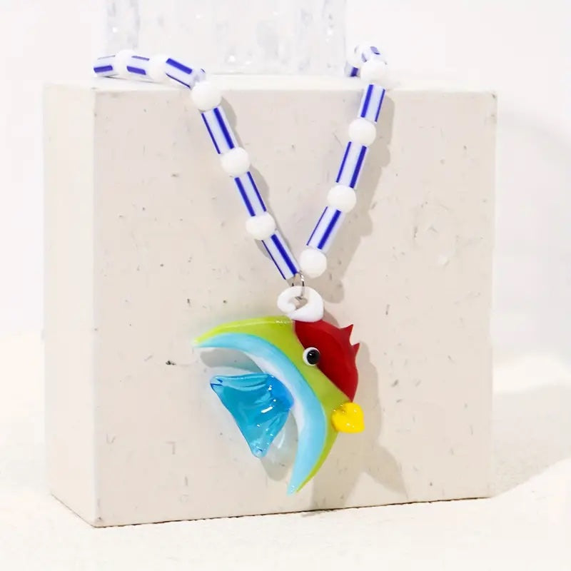 Su pez artesanal en vidrio y la combinación de cuentas rayadas hacen que este collar sea un verdadero protagonista del look.