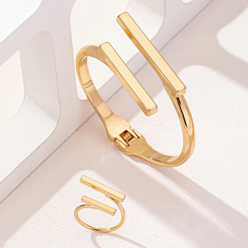 Conjunto de anillo y pulsera dorados con diseño minimalista en barras rectas.