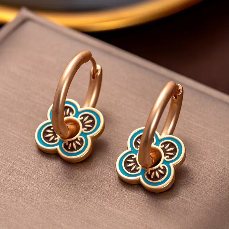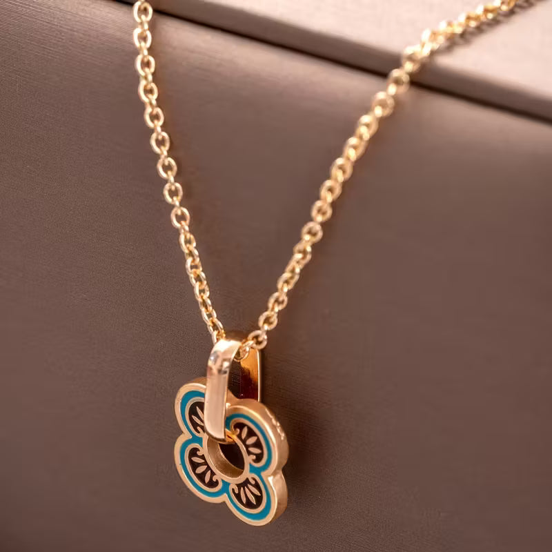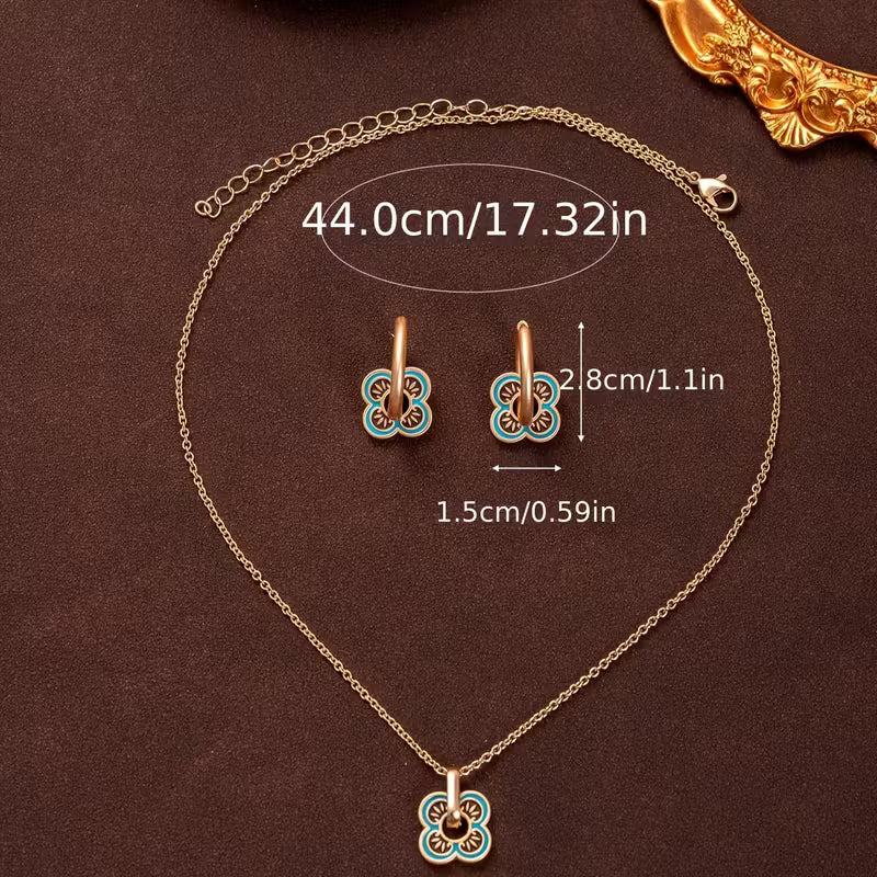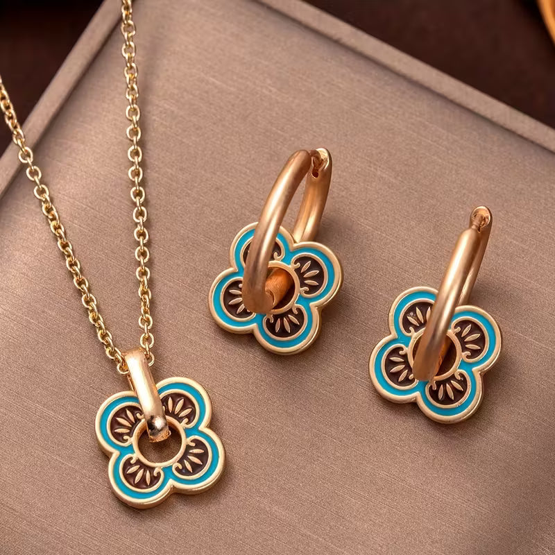 El SET SHEN combina collar y caravanas con un dije floral en tonos celeste y dorado, logrando una armonía perfecta entre suavidad, color y elegancia.