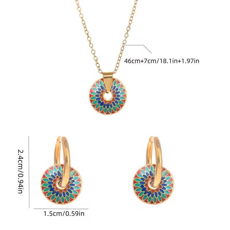 Incluye collar y caravanas doradas con dije circular esmaltado en rojo, verde, azul y toques de púrpura.
